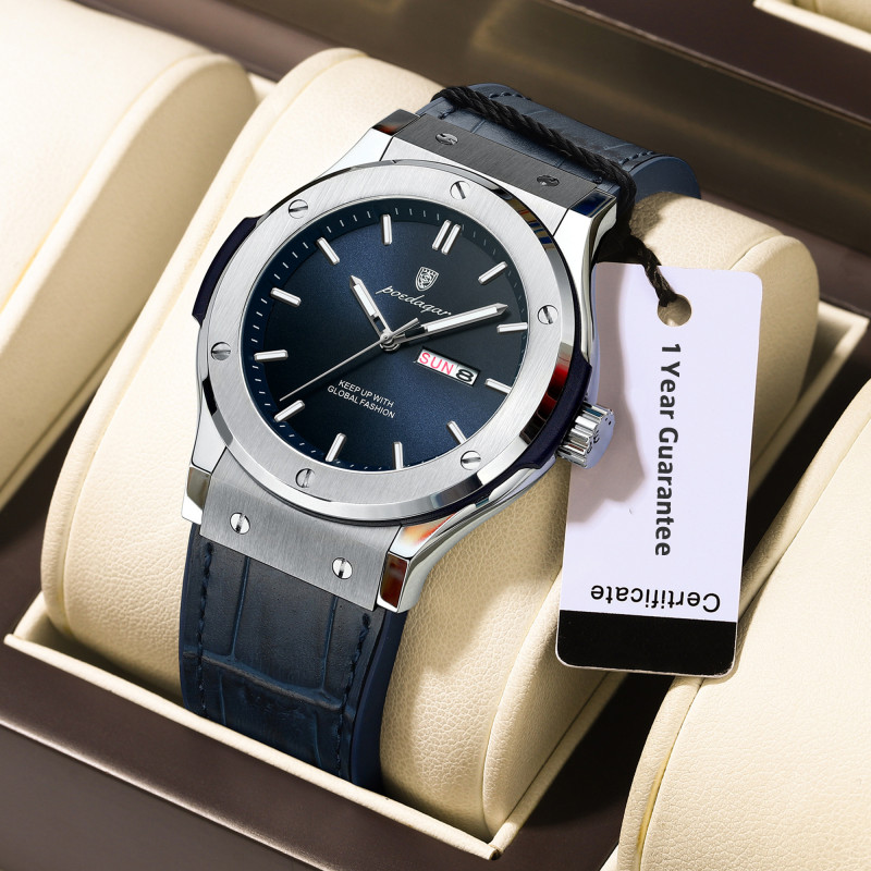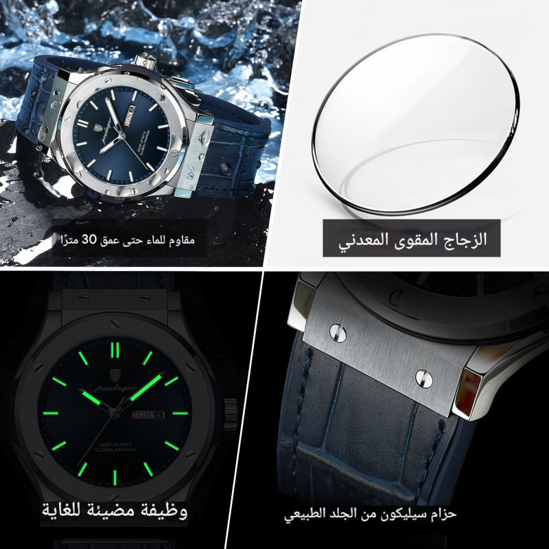 ساعة رجالية انيقة بتصميم سويسري ومقاومة للماء والخدش ومضيئة في الليل من ماركة Poedagar مع بطاقة ضمان لمدة سنة كاملة